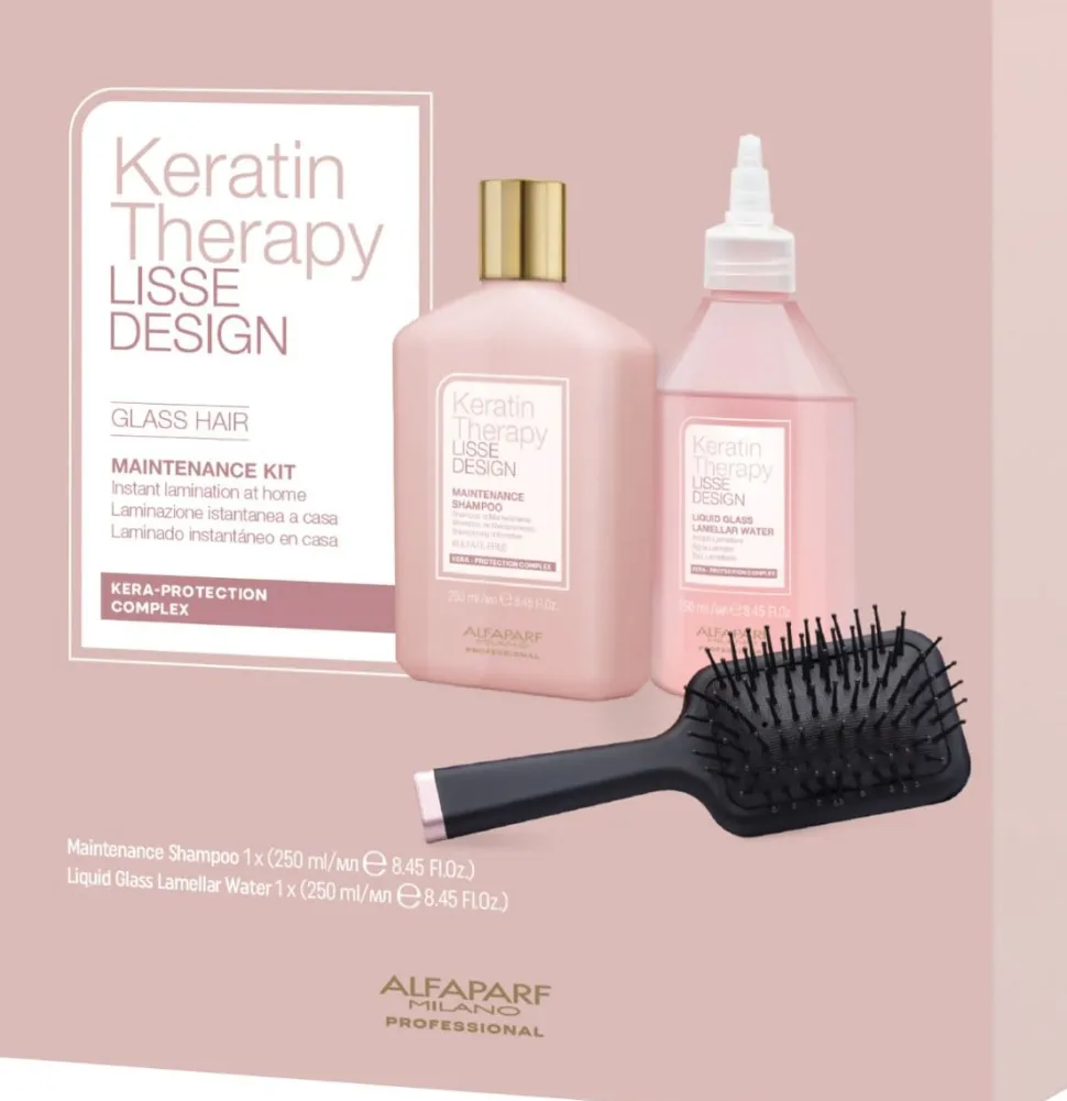 Keratin Therapy Lisse Design Glass Hair Vedligeholdelsessæt kombinerer to effektive hårplejeprodukter med en eksklusiv, professionel hårbørste for et velplejet, krusfrit hår med luksuriøs glans og langvarig smidighed.