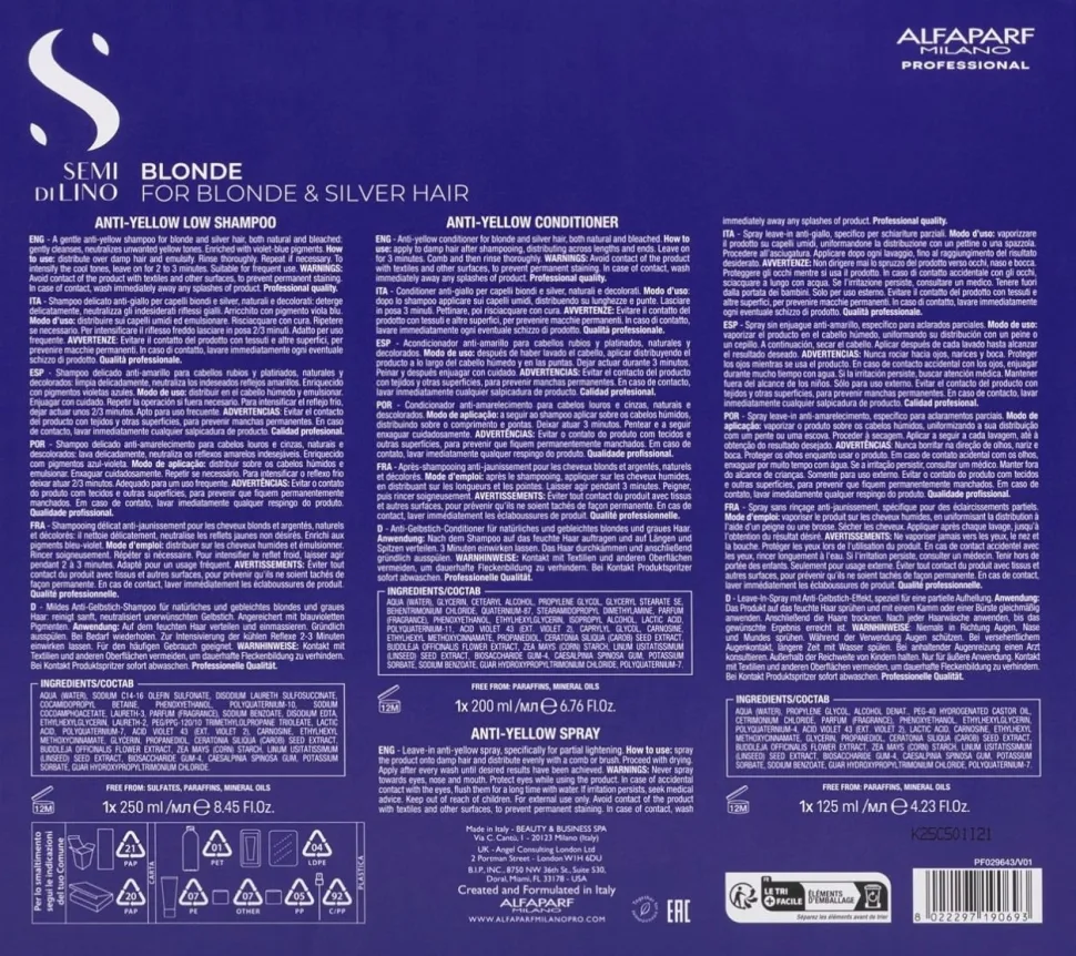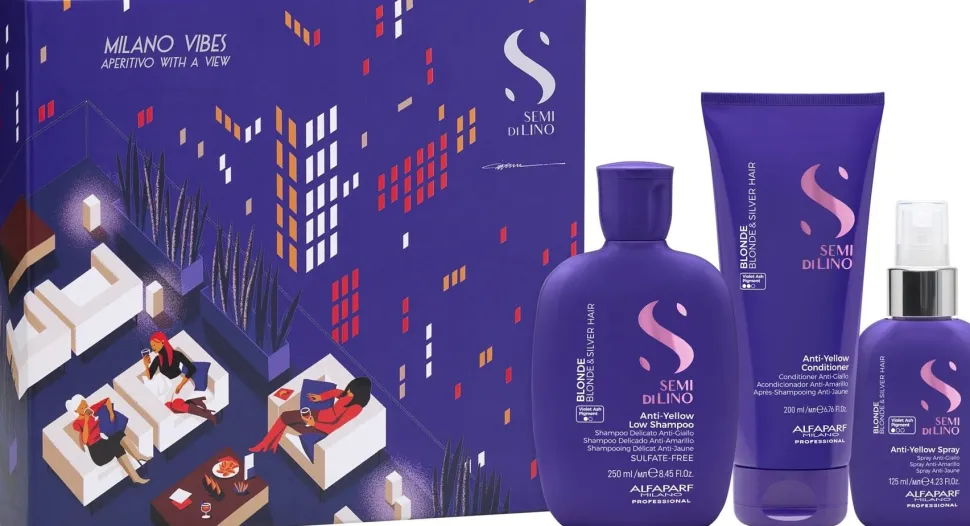 Semi di Lino Blonde-linjen fremhæver naturligt eller farvet blondt og sølvfarvet hår. Den neutraliserer uønskede gule toner, revitaliserer hårstrået og tilføjer fugt for blødt, skinnende hår.