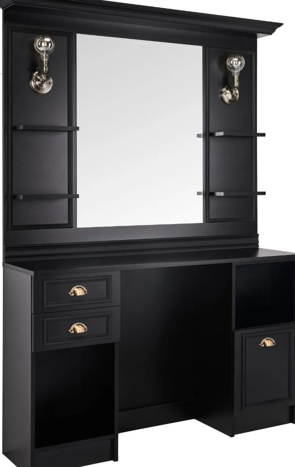 - Udstyret med hylder til kosmetik, åbent og lukket skab, skuffer
