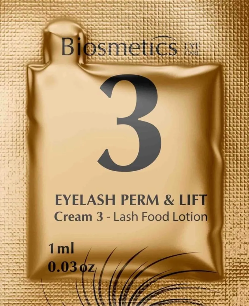 BIOSMETICS Cream No. 3 – Conditioning Food Lotion er den tredje og afsluttende fase i BIOSMETICS Lash Lift System. Den er beriget med nærende ingredienser som Panthenol, Arnica Montana, Aloe Barbadensis, Chamomilla Recutitia Flower Extract og Hydrolyseret Silke, der plejer og beroliger de behandlede vipper eller bryn efter løft- og farvningsprocessen.