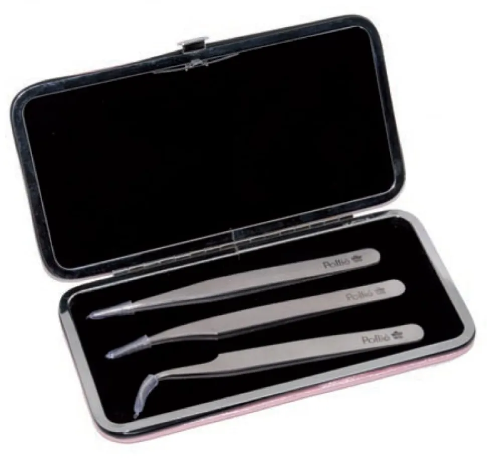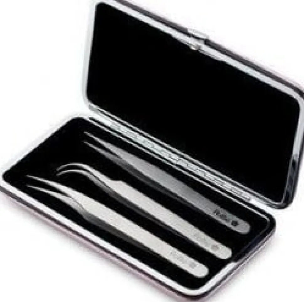 Sæt med 3 pincetter til placering af falske øjenvipper og eyelash extensions. Med en behagelig magnetisk metalkasse.