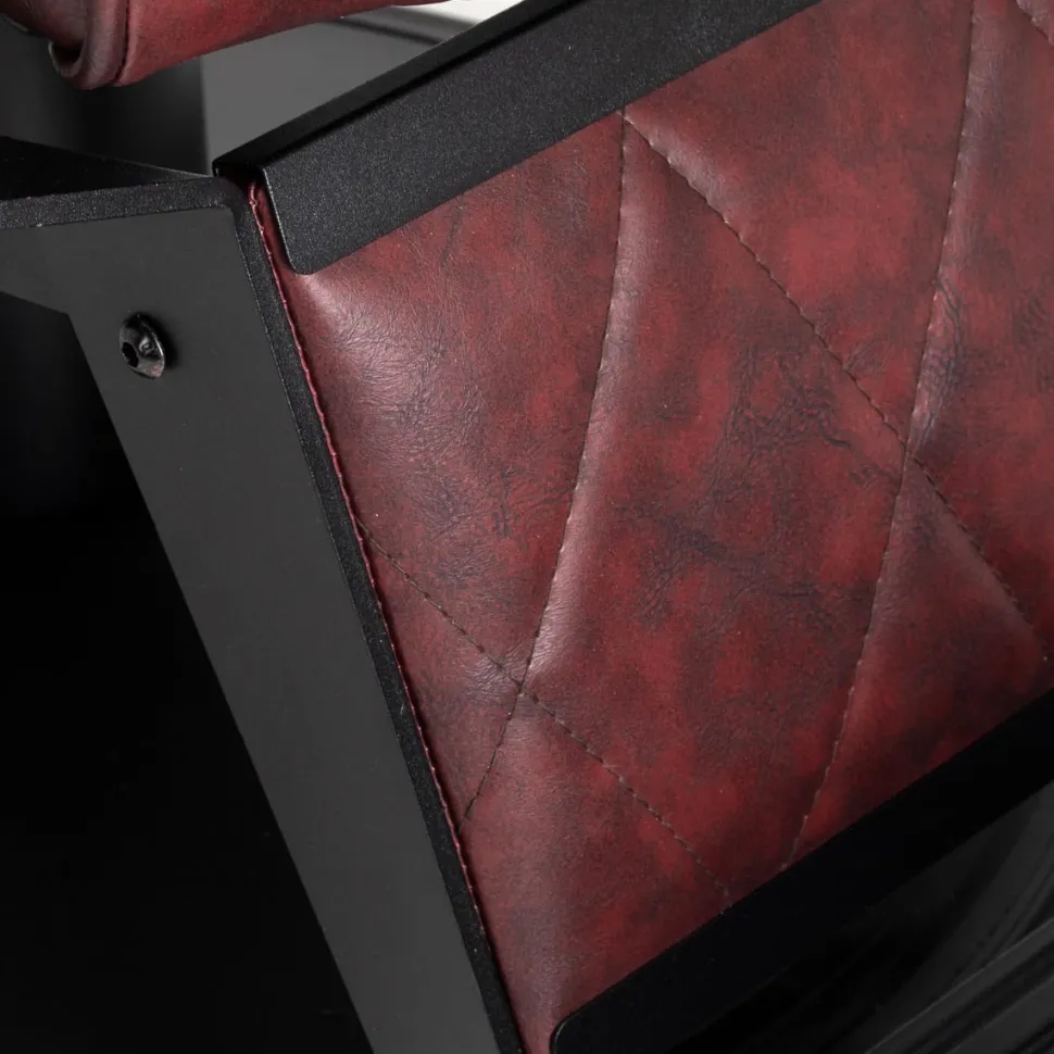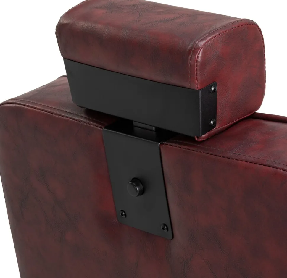 Stolens solide runde base er konstrueret for stabilitet og brugervenlighed. Sædefyldningen af deformation-resistent skum og polstringen af syntetisk læder med mat finish sikrer holdbarhed og komfort ved længerevarende brug. Det stilige syninger i polstringen tilføjer karakter og inspiration fra bildesign. Den burgunder farve giver stolen et unikt præg, mens den minimalistiske stil gør det nemt at integrere den i enhver barbershop.