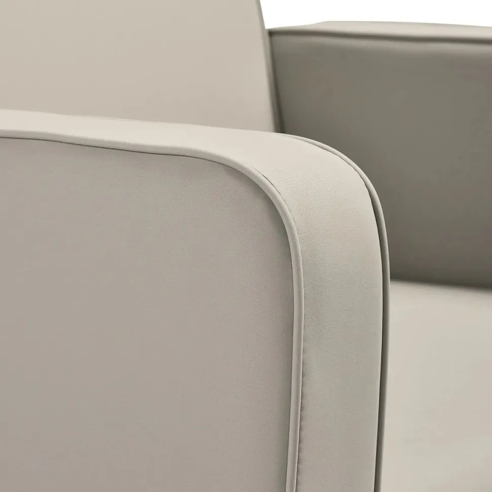Stolens geometriske linjer og blødt afrundede kanter skaber den perfekte balance mellem moderne enkelhed og komfort. Det firkantede sæde og subtilt vinklede armlæn skaber en harmonisk silhuet, der understøtter en afslappet holdning. Den optimalt tilbagelænede rygstøtte fremmer korrekt siddestilling og fuld afslapning. Polstret i høj kvalitet sort syntetisk læder er stolen både holdbar og nem at vedligeholde. Dens raffinerede geometriske design og matte sorte fittings – inklusive hanen, bruserhovedet og matchende slanger – fuldender udseendet og forstærker den elegante, sammenhængende stil i enheden og salonens interiør.