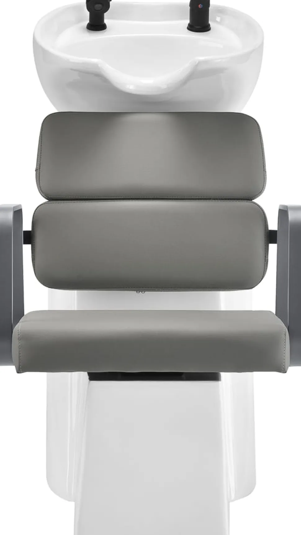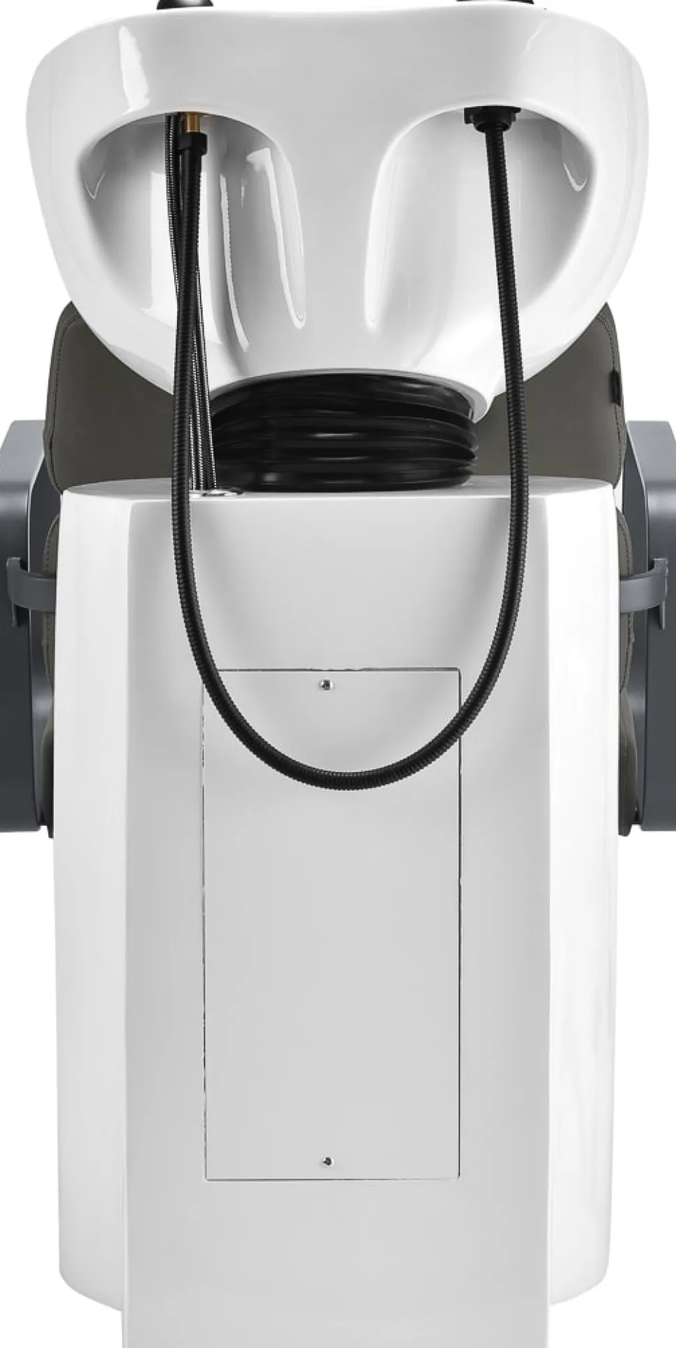 Vaskeenheden er udstyret med et mixerbatteri, som giver let adgang til varmt og koldt vand og gør det muligt at tilpasse temperaturen efter kundens præferencer. Der er et dedikeret sted til at hænge bruserhovedet, og en krombelagt prop med et særligt filter muliggør kontrol af vandstrøm og høj hygiejne i salonen. Vandtilslutningen er placeret i basen, så rørføringen kan skjules og give et rent, professionelt look. En markant fordel ved denne model er det åbne rum mellem ryg- og sæde, som gør det nemt at feje snavs ud og holde hele siddeområdet rent. Hårvaskeenheden er designet til at sikre komfort under forskellige behandlinger og giver god rygstøtte, hvilket gør arbejdsdagen mere behagelig.