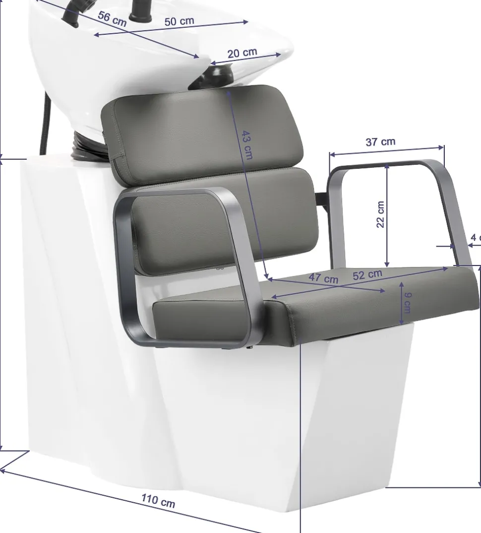 Den hvide keramiske vaskegryde er uden at sprøjte; dens passende dybde reducerer vand- og produktstænk betydeligt, hvilket giver behagelig og effektiv udførelse af et bredt spektrum af services. Vaskegryden kan vinkelsjusteres, så den passer til individuelle behov. Materialerne af høj kvalitet gør vaskeenheden holdbar, modstandsdygtig over for misfarvning og ridser, og nem at rengøre. En korrekt formet krave og en let tilbagelænet rygstøtte giver støtte og komfort under vask, og den behagelige sorte plast-overflade forhindrer klienten i at føle den kolde keramiske overflade.