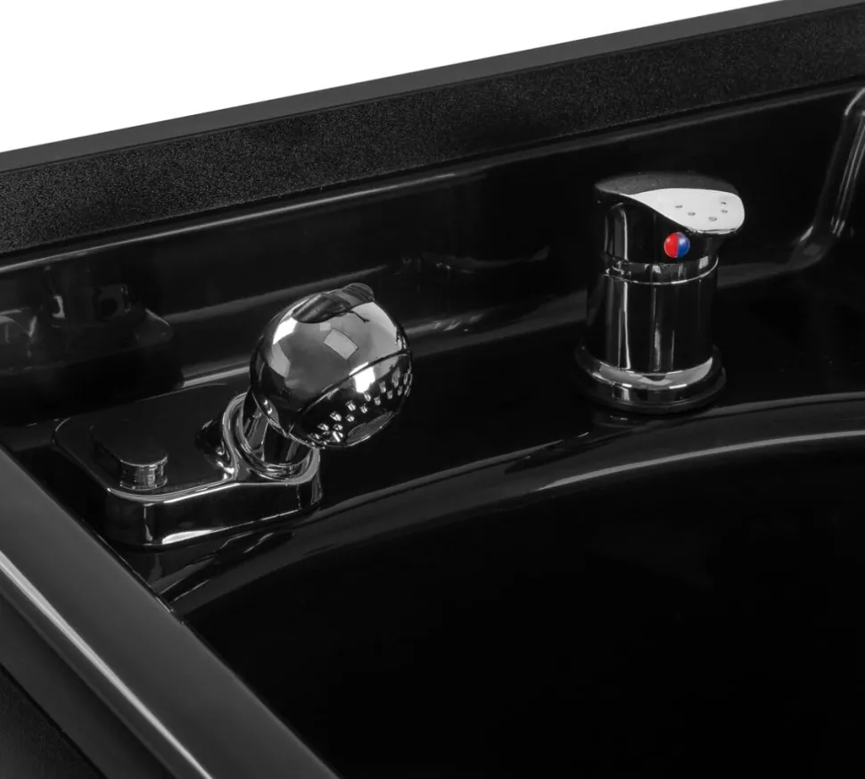Gabbiano Barber Station (model 5023) er en luksuriøs og funktionel salonstation til hårvask, der kombinerer stil med komfort. Den dybe sorte vaskeskål er lavet af slidstærk plast, der gør den nem at rengøre og sikrer en behagelig hovedposition for kunden.