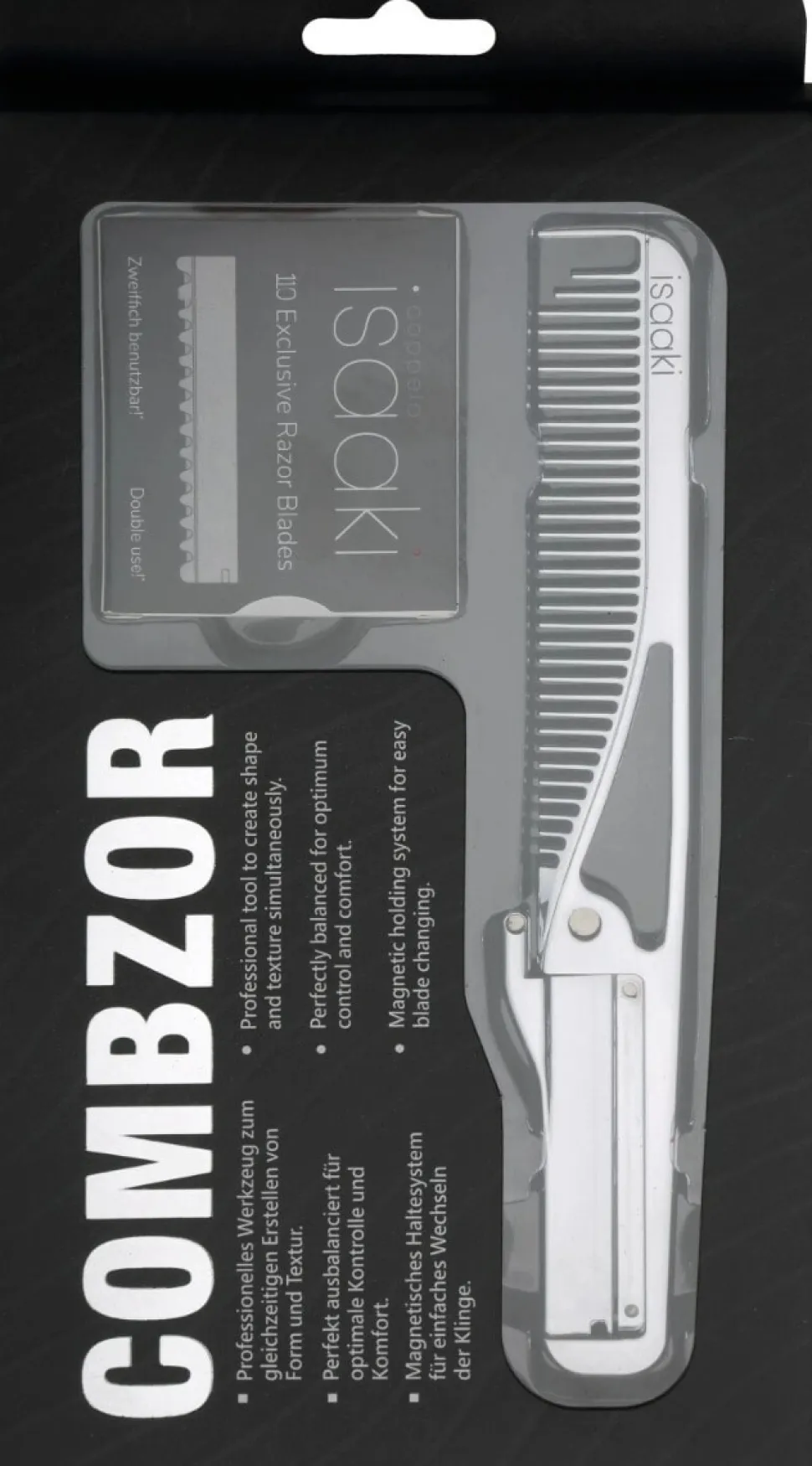 COMBZOR er et ALT-I-ÉN værktøj, der giver dig mulighed for at skabe form og tekstur på samme tid. Det innovative COMBZOR kombinerer opdeling/separering, kamning og klipning i ét værktøj. COMBZOR er også fremragende til at klippe og justere hårforlængelser. Pakken indeholder 10 blade for maksimal brugervenlighed.