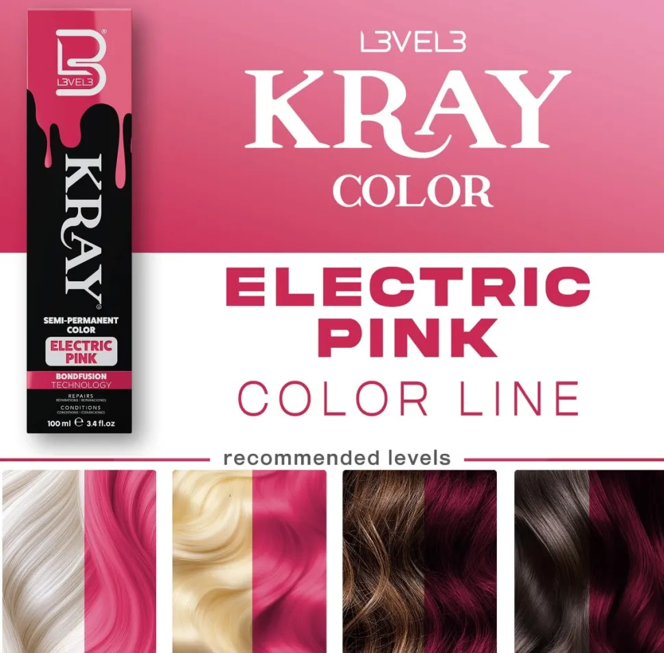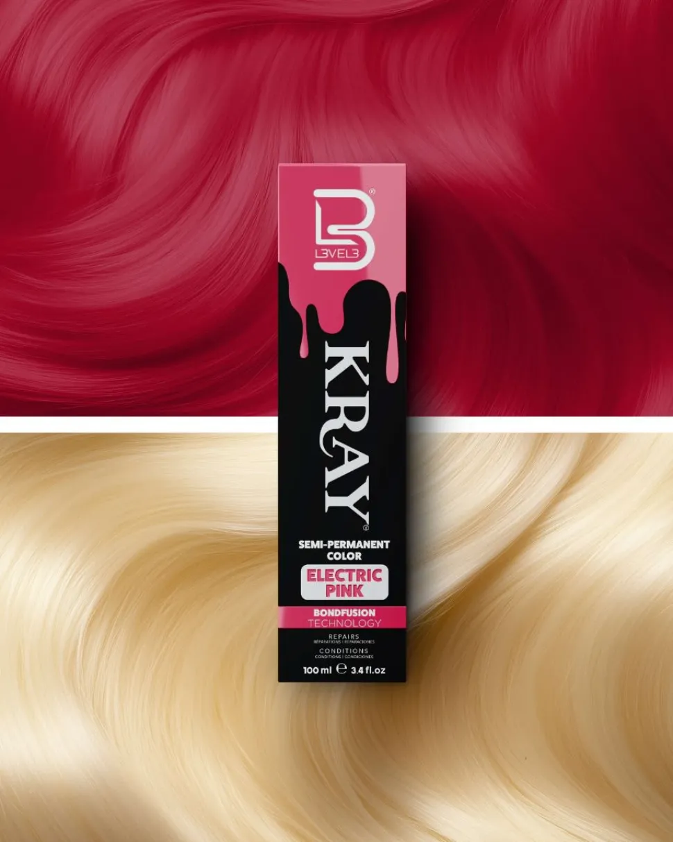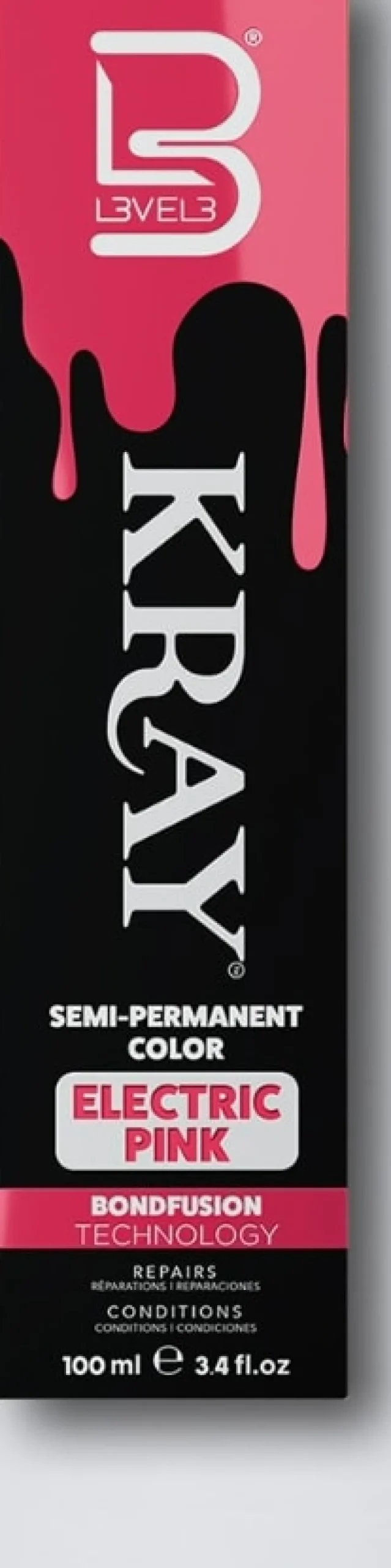 - L3VEL3 KRAY Semi-Permanent Color er din løsning for at skabe dristige, levende looks med lethed. Beriget med nærende ingredienser og BondFusion Technology, giver det dig friheden til at eksperimentere med en bred vifte af nuancer, mens dit hår forbliver sundt og beskyttet.