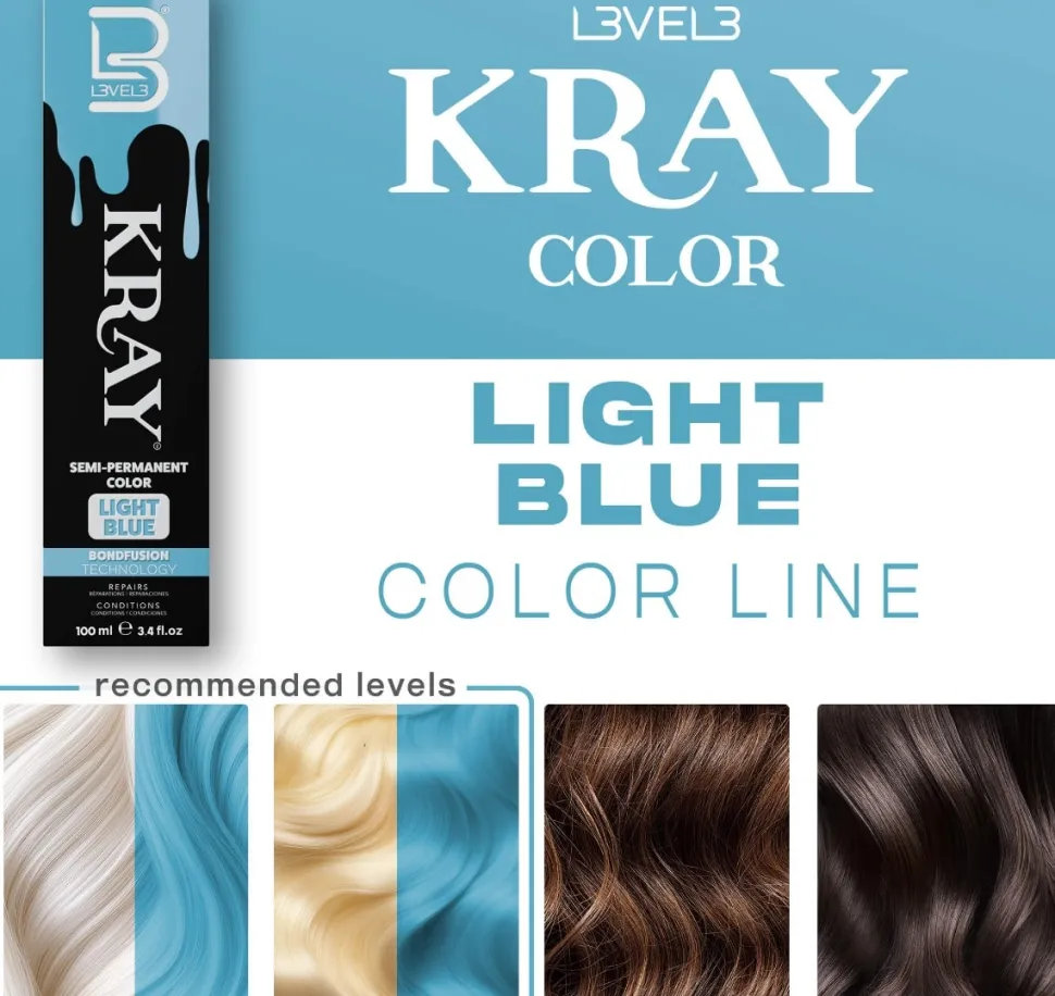 - L3VEL3 KRAY Semi-Permanent Color er din løsning for at skabe dristige, levende looks med lethed. Beriget med nærende ingredienser og BondFusion Technology, giver det dig friheden til at eksperimentere med en bred vifte af nuancer, mens dit hår forbliver sundt og beskyttet.