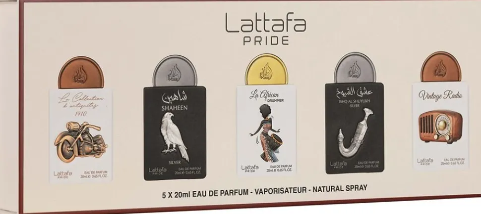 Lattafa Pride Gavesæt No.5 indeholder fem 20ml unisex dufte: La Collection D’Antiquités 1910, Shaheen Silver, La African Drummer, Ishq Al Shuyukh Silver og Vintage Radio. Kombinationen af rige, træagtige, orientalske og friske akkorder giver dette kuraterede sæt en alsidig duftrejse, perfekt til prøvning, gavegivning eller rejse, mens det fremviser moderne elegance og karakteristisk særpræg.
