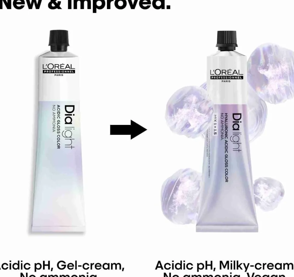 Dia Light Acidic Gloss Color er en banebrydende måde at tone, friske op og tilføje glans til håret. Dia Light er vores første sure demi-permanente hårfarve beriget med hyaluronsyre, som straks hydraterer under farveprocessen og bekæmper tørhed* – et af de første synlige tegn på hårskader. Dia Light neutraliserer uønskede undertoner efter lysning, genopfrisker bløde længder efter tidligere farvetjenester og giver glans for at bringe kedeligt hår tilbage til livet. Det har en unik sur pH-teknologi designet eksklusivt til professionelt brug.