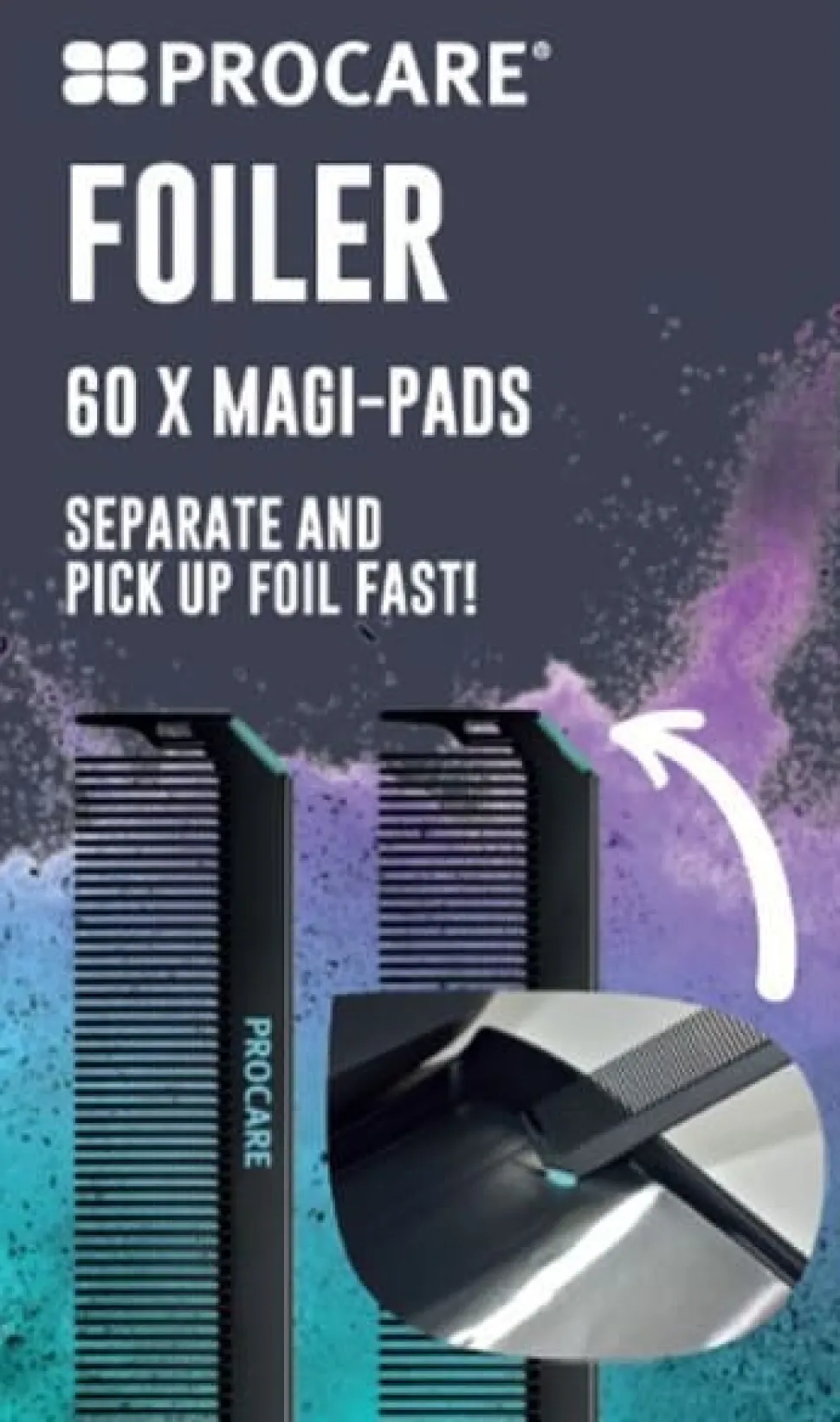 Procares Fast Foiler™ er en højkvalitets carbon pintail kam med en innovativ magi-pad, der gør det super nemt at samle op og adskille folieark. Anbring blot magi-pad’en på arket og tag det op: ikke mere besværlig adskillelse og en ren folie hver gang.
