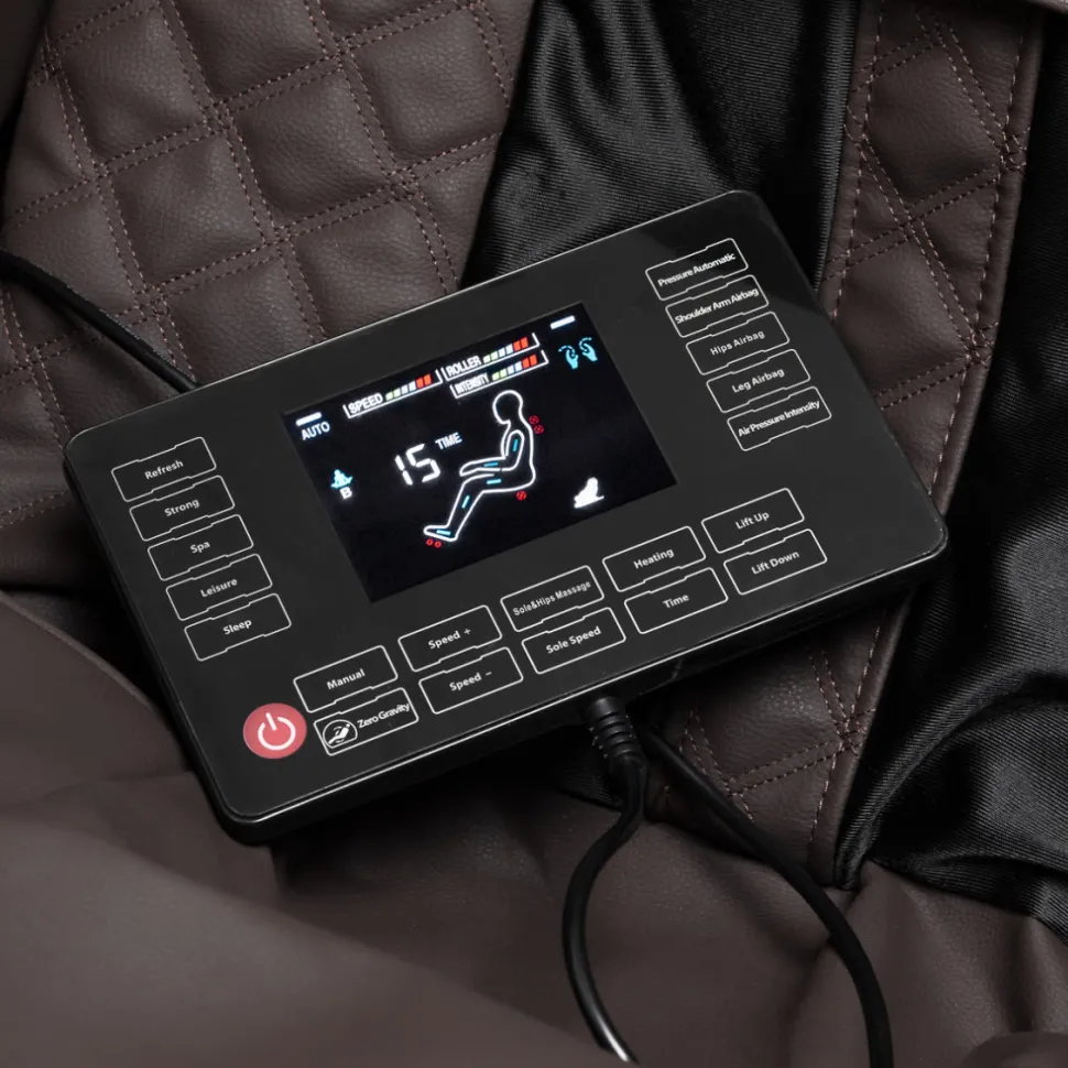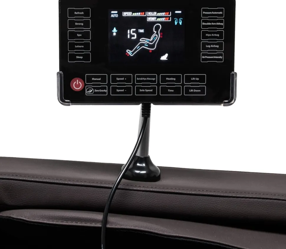 Det klare betjeningspanel med LCD-skærm sikrer nem og intuitiv betjening af stolen. Panelet kan bekvemt placeres på grebet monteret på det højre armlæn eller holdes i hånden. Den klare skærm viser den aktuelle drift af enheden, herunder masserede kropsområder, massageintensitet, behandlingstid og det valgte program. Panelet tillader præcis justering af stolens indstillinger og massagefunktioner samt valg af sessionens varighed, som kan være 5, 10, 15, 20, 25 eller 30 minutter.