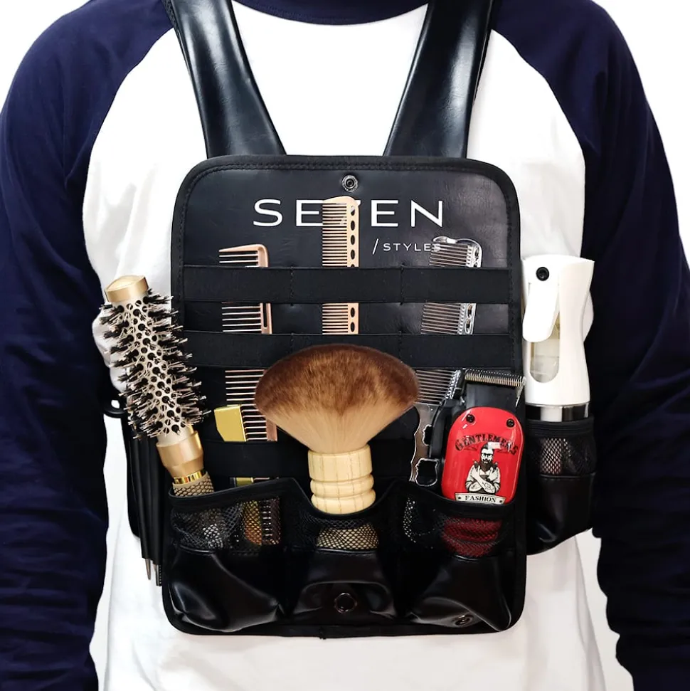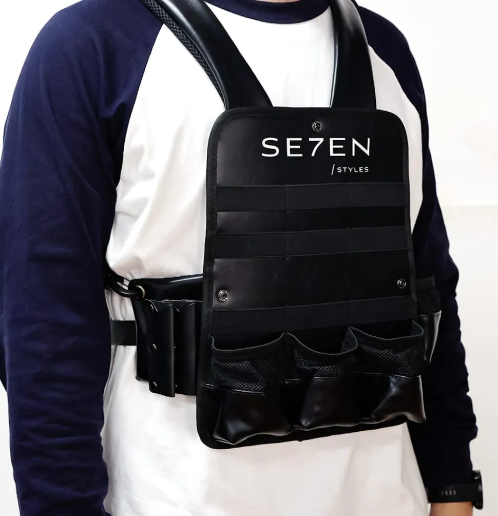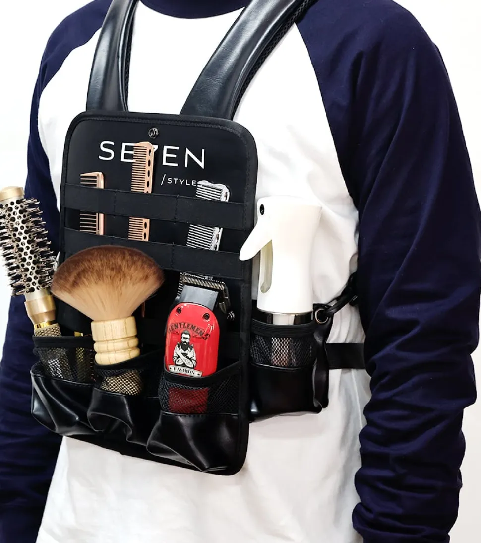 Se7en Styles Pro Chest Holster er designet til at give frisører optimal organisation og tilgængelighed. Tasken har rum, der giver rigelig plads til at opbevare og organisere værktøj som klippere, sakse, kamme og andet udstyr. Det ergonomiske design sikrer maksimal komfort, da tasken bæres over skuldrene og fastgøres rundt om brystet, hvilket fordeler vægten jævnt og minimerer belastningen på ryg og skuldre. Med justerbare stropper kan tasken tilpasses for en sikker og behagelig pasform. Fremstillet af holdbare materialer som nylon og PU-læder er tasken vandafvisende og beskytter dit værktøj. Tasken tilføjer et professionelt touch til dit look og viser din dedikation til håndværket.