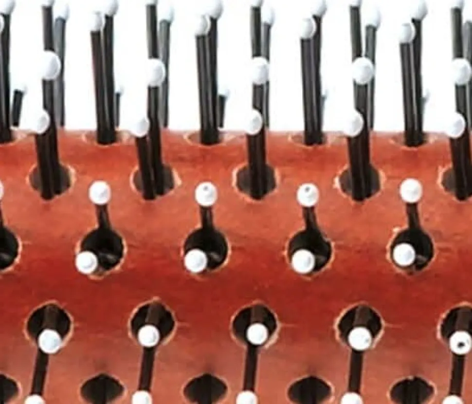 Nylonbørster med kuglespidser monteret på træ med gummigreb. Nylonstifter med kuglespidser er lettere at bruge på kraftigt hår, fordi de fordeler håret ensartet over børsten. Kuglespidserne behandler også hårbunden blidt.
