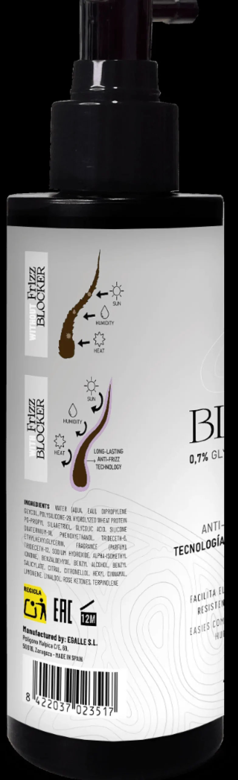 Frizz Blocker indeholder en AVANCERET thermo-aktiv vegetabilsk protein co-polymer, som skaber en usynlig kappe, der forsegler hårfiberen og giver langvarige anti-frizz, anti-fugt og termiske beskyttelseseffekter.