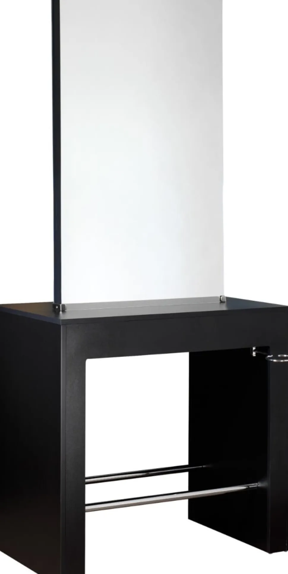 Mørk betjeningsplads lavet af træ med spejl, fold-ud holder til hårtørrer, integreret stabil fodstøtte, fås i en enkelt eller dobbelt version.