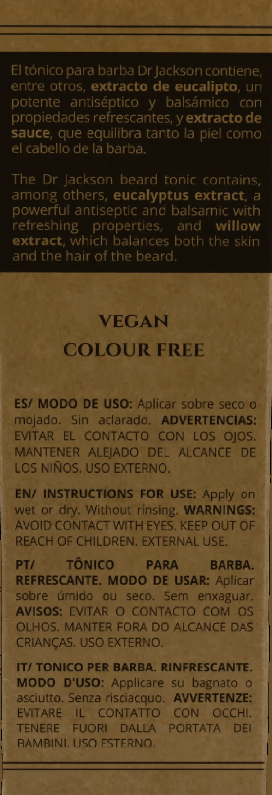 Dr. Jackson Elixir 5.1 Beard Tonic er en luksuriøs skæg tonic, der er designet til at pleje og styrke dit skæg. Denne tonic er beriget med naturlige ingredienser, der fugter, blødgør og giver næring til både skægget og huden under.