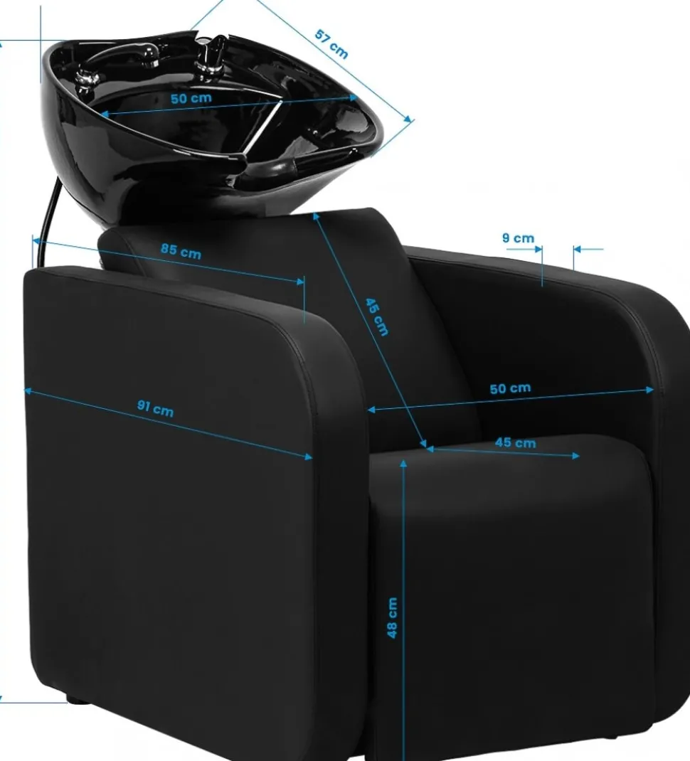 Gabbiano Sylvia vaskeenheden er designet med fokus på behagelig udførelse af pleje- eller farvebehandlinger samt at give klienten en komfortabel position under længere procedurer. Den enkle og geometriske form giver et moderne præg, mens sædeets og armlænenes lige linjer bidrager til et moderne udtryk. Ryggen er vippet i en optimal vinkel for fremragende støtte til rygsøjlen. Det profilerede sæde er fyldt med holdbar skum, hvilket sikrer høj komfort, og det polstrede armlæn muliggør korrekt skulderpositionering. Det syntetiske læder i sorte nuancer sikrer lang holdbarhed og nem rengøring. Det elegante, minimalistiske look giver interiøret et unikt præg. Sættet inkluderer komplette fittings i sorte og krom farver, herunder en vandhane, bruserhoved og dedikerede slang til at give et komplet arbejds-sæt.