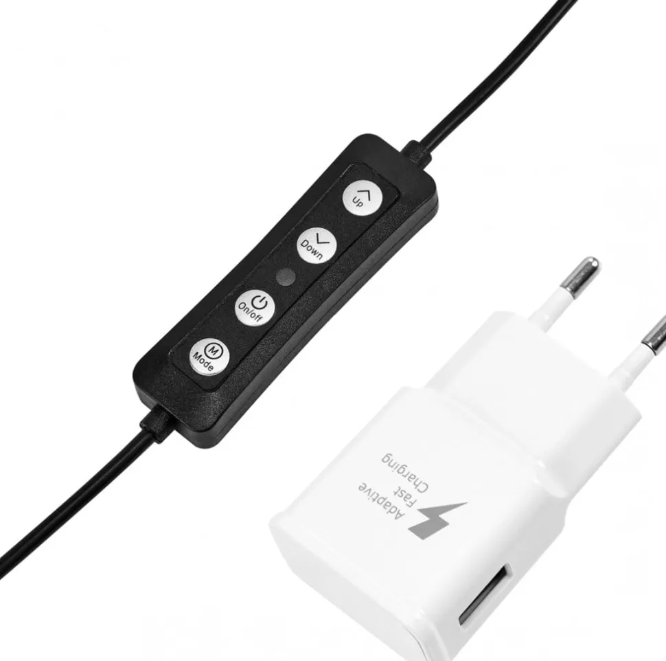 - Telefonholder: Inden i lampekransen er der et gevindadapter til installation af en fleksibel telefonholder, som følger med i sættet og passer til de fleste smartphones (udvides op til 15 cm).