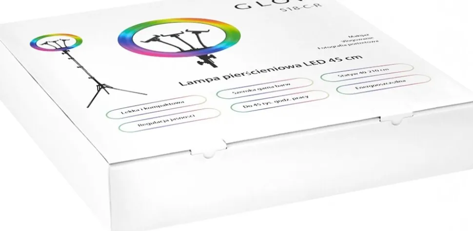 GLOW-produkter tilbyder professionel belysning, der forbedrer udførelsen af tjenester i skønhedssaloner og medicinske kontorer. Denne Glow ringlygte med en diameter på 45 cm er en praktisk enhed, der giver fremragende lys til arbejdspladser i skønhedssaloner, frisørsaloner eller tatovørstudier, og den er også velegnet til fotografi, videoptagelse og indhold til sociale medier.