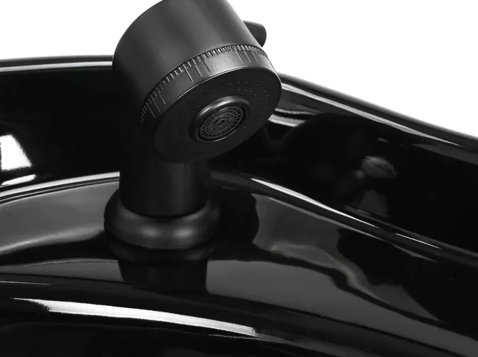 Den dybe keramiske skål i elegante sorte nuancer er designet til at minimere sprøjt under behandlinger. Den vipbare skål muliggør præcis justering for hver kundes komfort. Lavet af holdbar keramik, modstår skålen misfarvning, ridser og skader fra kemikalier, og dens glatte overflade er nem at rengøre. Den ergonomisk formede krave giver blid hovedstøtte, mens den sorte plastkant forhindrer den kolde berøring af keramikken for øget komfort.