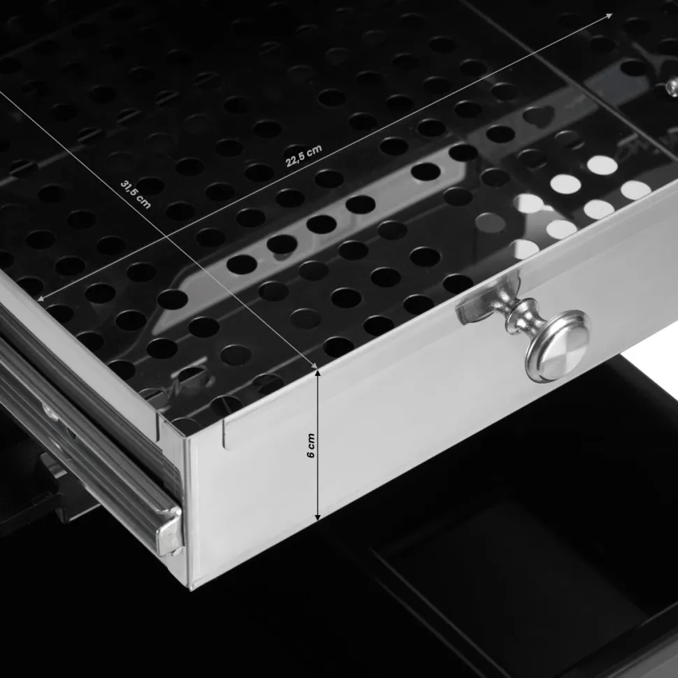 Den installerede UV-C-sterilisator i hjælpen er en fremragende løsning, der sikrer sikkerheden ved de udførte behandlinger. Den vil hurtigt rengøre overfladerne på værktøjerne fra de fleste patogener. Indersiden af enheden er lavet af kirurgisk stål og er spejlvendt, hvilket reflekterer UV-strålerne og sikrer en grundigere desinfektion. En effektiv kvarts lampe med en bølgelængde på 254 nm ødelægger effektivt forskellige former for mikroorganismer. Den foreslåede varighed af processen er 10 minutter, men du kan frit justere denne værdi inden for 5-30 minutter, som tælles ned af det digitale display.