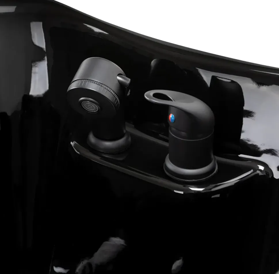 Den keramiske skål, færdiggjort i slanke sorte nuancer, har en moderne form og optimal dybde, der forhindrer sprøjt og sikrer ren, effektiv drift. Den ergonomisk formede nakkestøtte og den vinklede rygstøtte giver overlegen komfort under hårvask, mens det beskyttende plastdække beskytter kunden mod kontakt med den kolde keramiske overflade, hvilket skaber en behagelig og afslappende oplevelse.