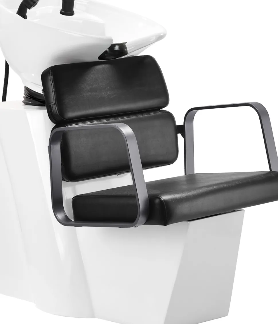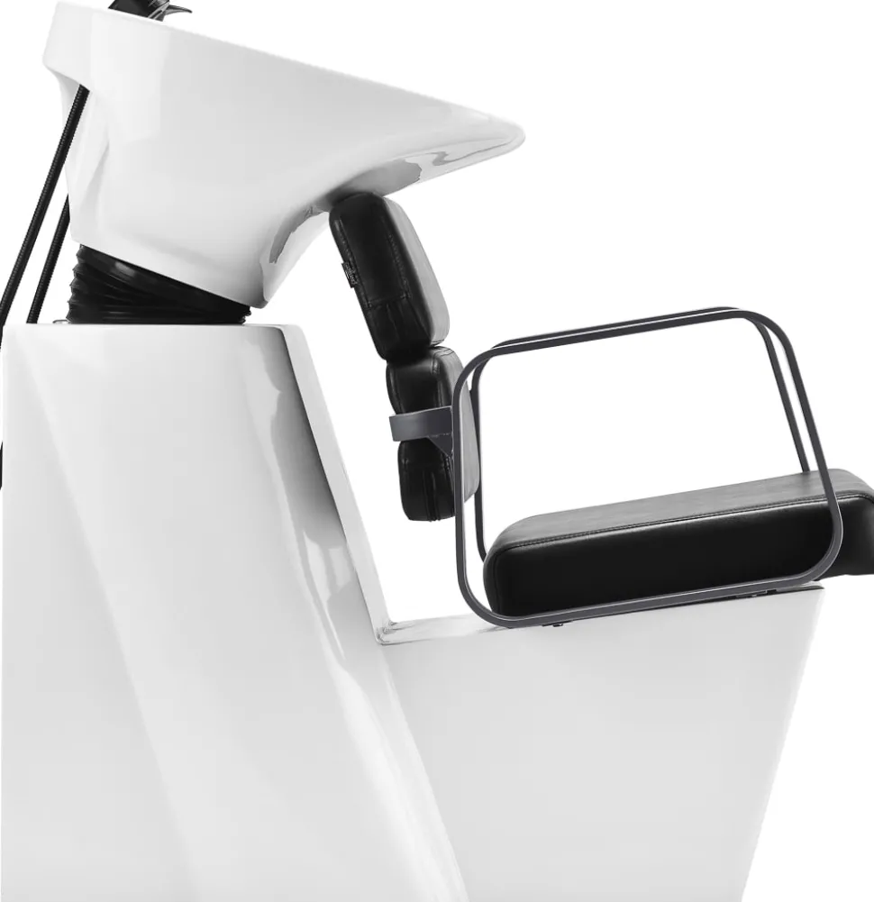 Vaskeenheden er udstyret med et mixerbatteri, som giver let adgang til varmt og koldt vand og gør det muligt at tilpasse temperaturen efter kundens præferencer. Der er et dedikeret sted til at hænge bruserhovedet, og en krombelagt prop med et særligt filter muliggør kontrol af vandstrøm og høj hygiejne i salonen. Vandtilslutningen er placeret i basen, så rørføringen kan skjules og give et rent, professionelt look. En markant fordel ved denne model er det åbne rum mellem ryg- og sæde, som gør det nemt at feje snavs ud og holde hele siddeområdet rent. Hårvaskeenheden er designet til at sikre komfort under forskellige behandlinger og giver god rygstøtte, hvilket gør arbejdsdagen mere behagelig.