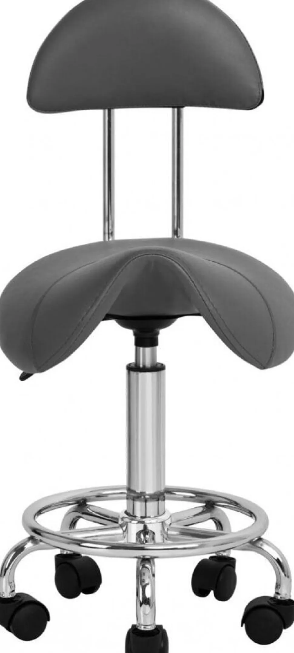 Behagelig, stabil kosmetisk skammel med rygstøtte, med en profileret sæde, på en femstjernet base med plastikhjul. Fås i GRÅ farve, et nødvendigt møbel i en skønhedssalon.