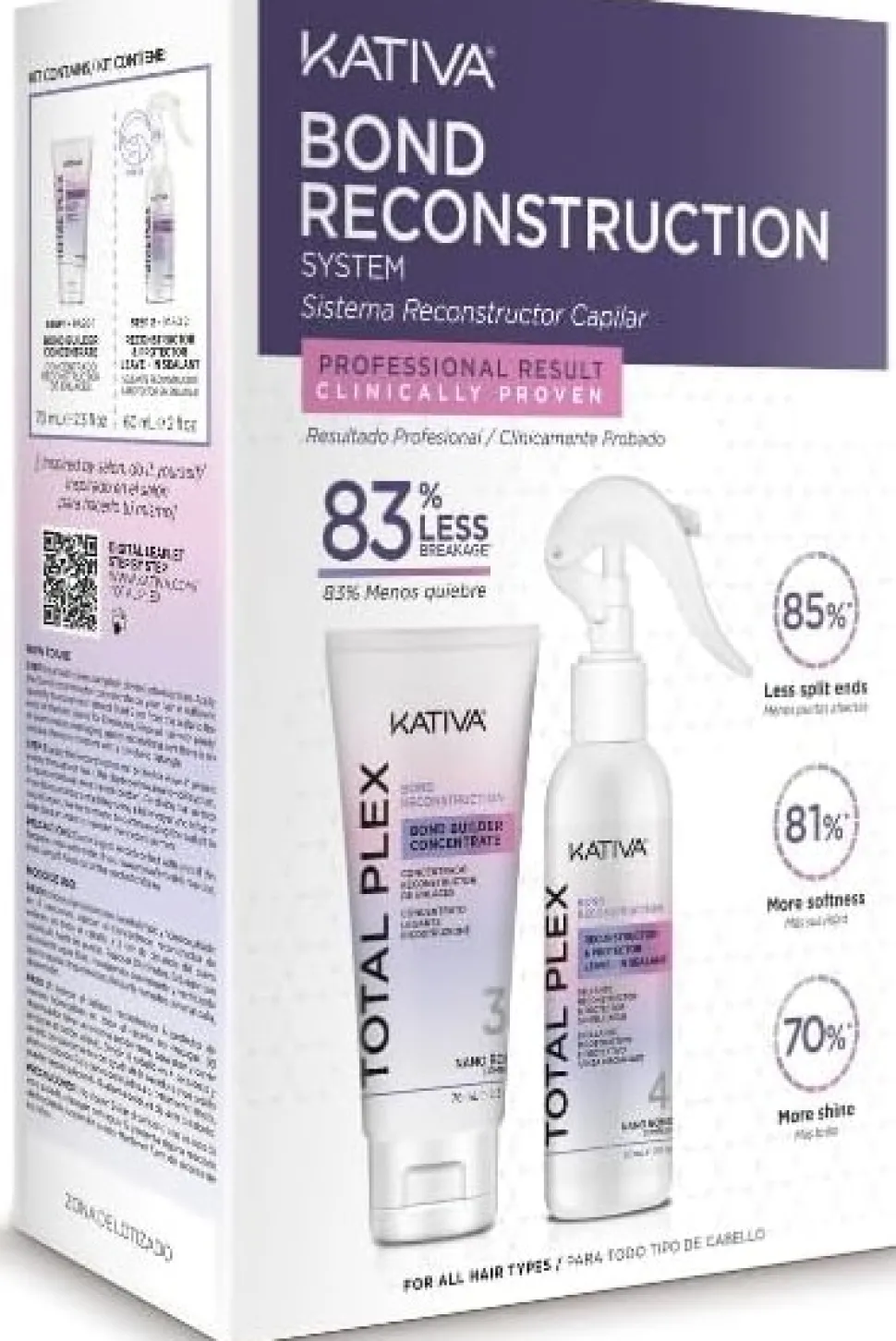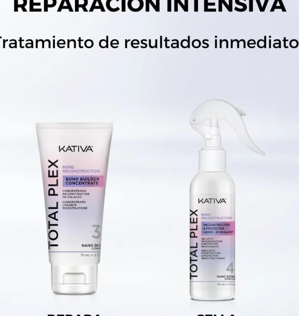 Kativa Total Plex Bond Repair Kit er et effektivt to-trins system designet til at genopbygge keratinbindinger og reversere hårskader forårsaget af farvning, misfarvning, høje temperaturer, UV-stråler og tidens gang.