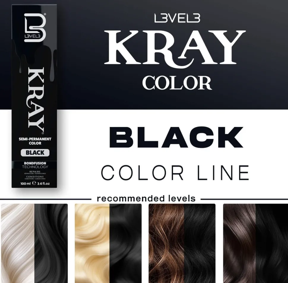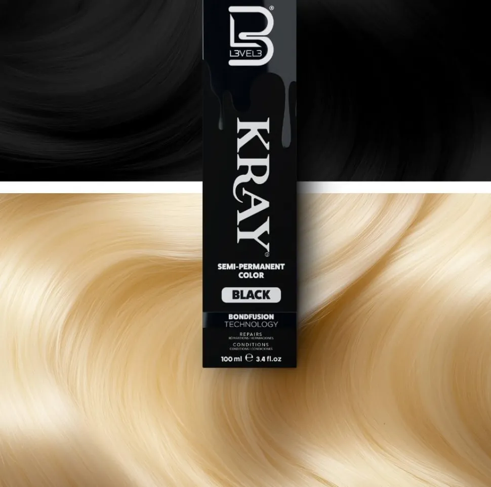 - L3VEL3 KRAY Semi-Permanent Color er din løsning for at skabe dristige, levende looks med lethed. Beriget med nærende ingredienser og BondFusion Technology, giver det dig friheden til at eksperimentere med en bred vifte af nuancer, mens dit hår forbliver sundt og beskyttet.
