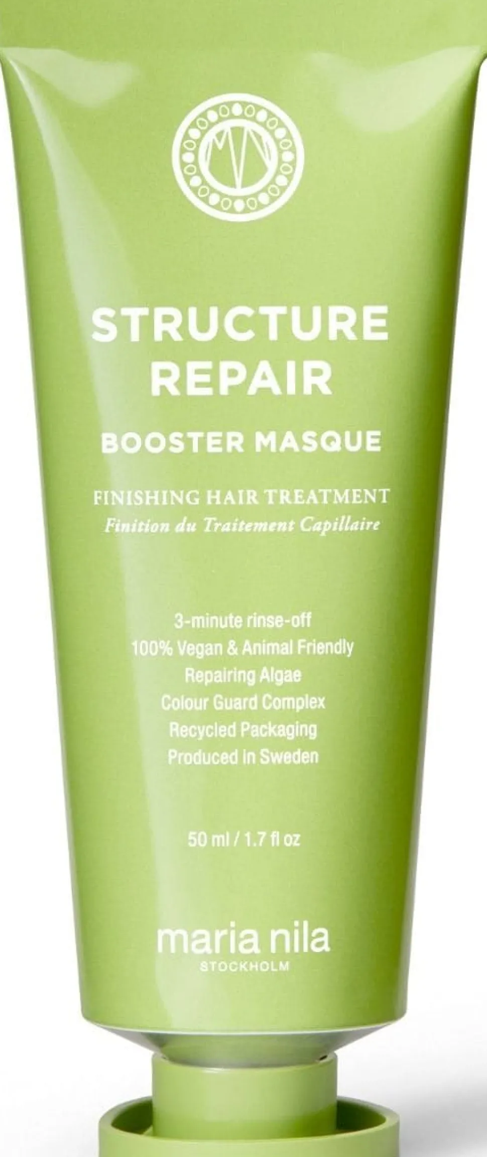 Maria Nila Structure Repair Booster Masque er en dybt nærende afsluttende behandling med reparerende alger, der efterlader beskadiget, tørt og kemisk behandlet hår blødt og skinnende på kun 3 minutter. Den erstatter både hårmaske og balsam. Structure Repair har en blød duft af vanilje, rose og jasmin.