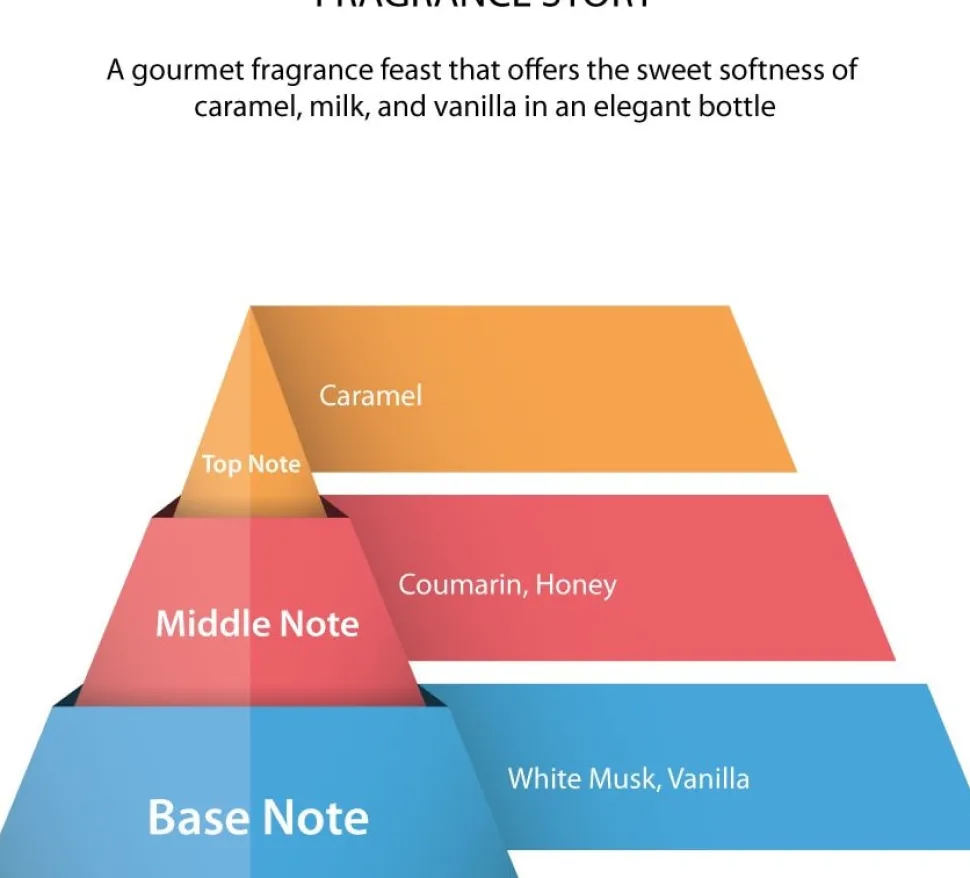 En gourmetduftfest, der tilbyder den søde blødhed af karamel, mælk og vanilje i en elegant flaske.