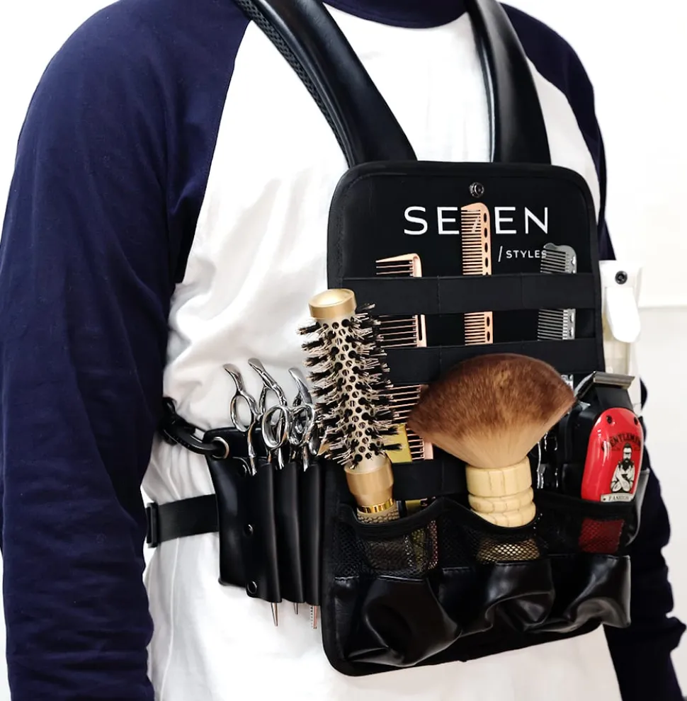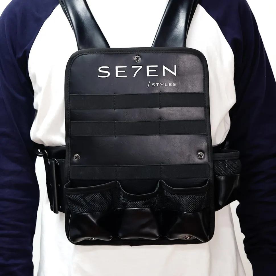 Se7en Styles Pro Chest Holster er designet til at give frisører optimal organisation og tilgængelighed. Tasken har rum, der giver rigelig plads til at opbevare og organisere værktøj som klippere, sakse, kamme og andet udstyr. Det ergonomiske design sikrer maksimal komfort, da tasken bæres over skuldrene og fastgøres rundt om brystet, hvilket fordeler vægten jævnt og minimerer belastningen på ryg og skuldre. Med justerbare stropper kan tasken tilpasses for en sikker og behagelig pasform. Fremstillet af holdbare materialer som nylon og PU-læder er tasken vandafvisende og beskytter dit værktøj. Tasken tilføjer et professionelt touch til dit look og viser din dedikation til håndværket.