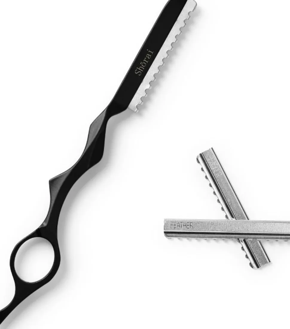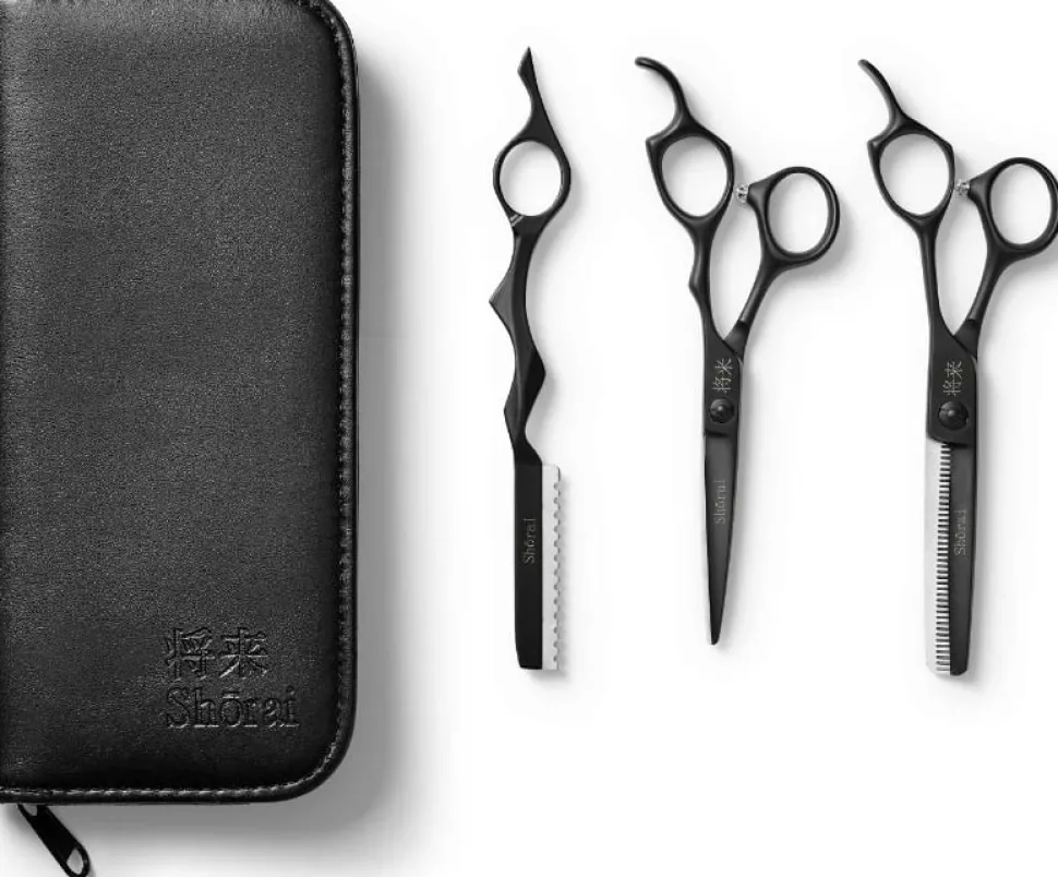 Shōrai ergonomisk saks sæt er det perfekte startkit til studerende og lærlinge. Det inkluderer en 5,5” ergonomisk saks og en 6” udtyndingssaks samt en matchende barberkniv (1 stk. blad inkluderet). Designet til komfort og præcision, tilbyder disse sakse en permanent fingerstøtte, ergonomisk offset-håndtag og små fingerhuller for et sikkert greb. Den matte sorte finish tilføjer et elegant touch, og den højkvalitets håndværk, kombineret med sættets overkommelige pris, gør det til en fremragende værdi.