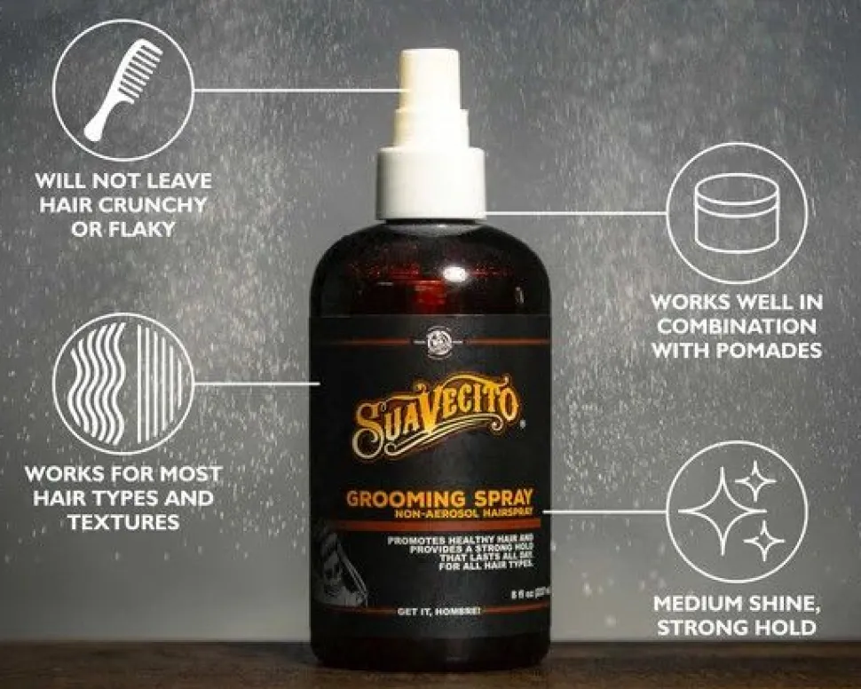 Vores Grooming Spray er en ikke-aerosol styling spray til dit hår og kan bruges sammen med vores pomader eller uden. Denne hårspray er lavet for at sikre, at du opfylder kravene til din personlige stil. Med blot et par pump fra flasken vil denne grooming spray låse din stil med et jernfast greb. Brug den til at fugte dit hår, inden du påfører pomade, eller efter for at låse produktet for et ekstra stramt hold. Den kan også bruges alene for et lettere hold og et løsere look, der ikke stivner for meget. Denne hårspray giver en sund glans til dit hår og har en ikke-flassende formel, der ikke vil irritere dit hår eller din hovedbund. Det er den perfekte tilføjelse til din stylingrutine og vores pomader.