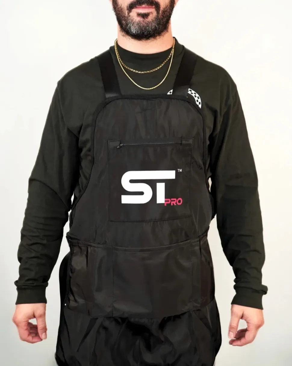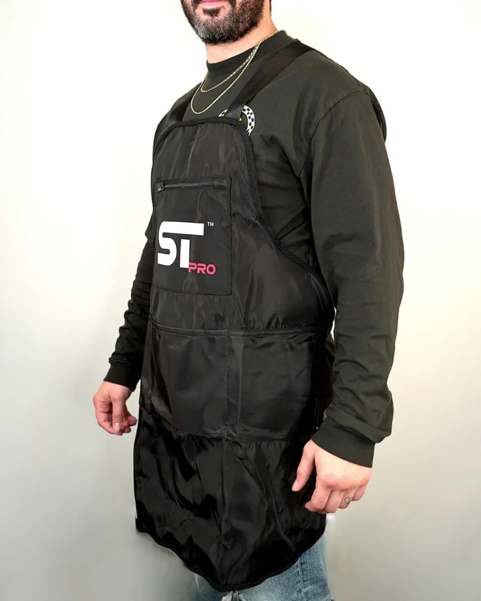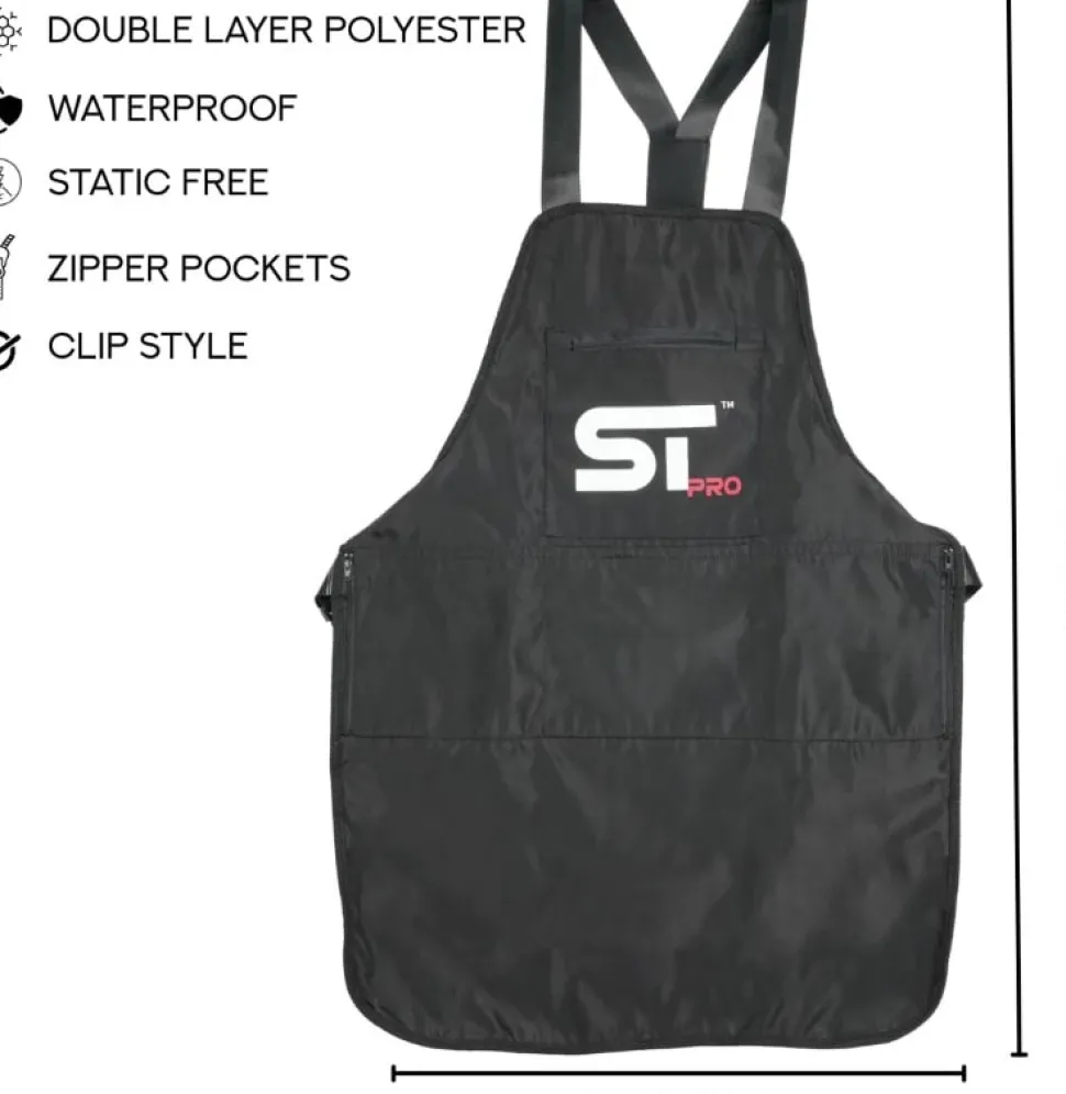 Fremstillet i vandafvisende, blegemiddelbestandigt stof med en holdbar PVC-bund, som stopper spild, hårklip og pletter, så dine klæder holdes rene og tørre hele dagen. Med fire rummelige lynlåslukkede lommer kan du organisere klippere, sakse, guider og stylingprodukter lige der, hvor du har brug for dem — ikke længere jagt rundt midt i klippet.