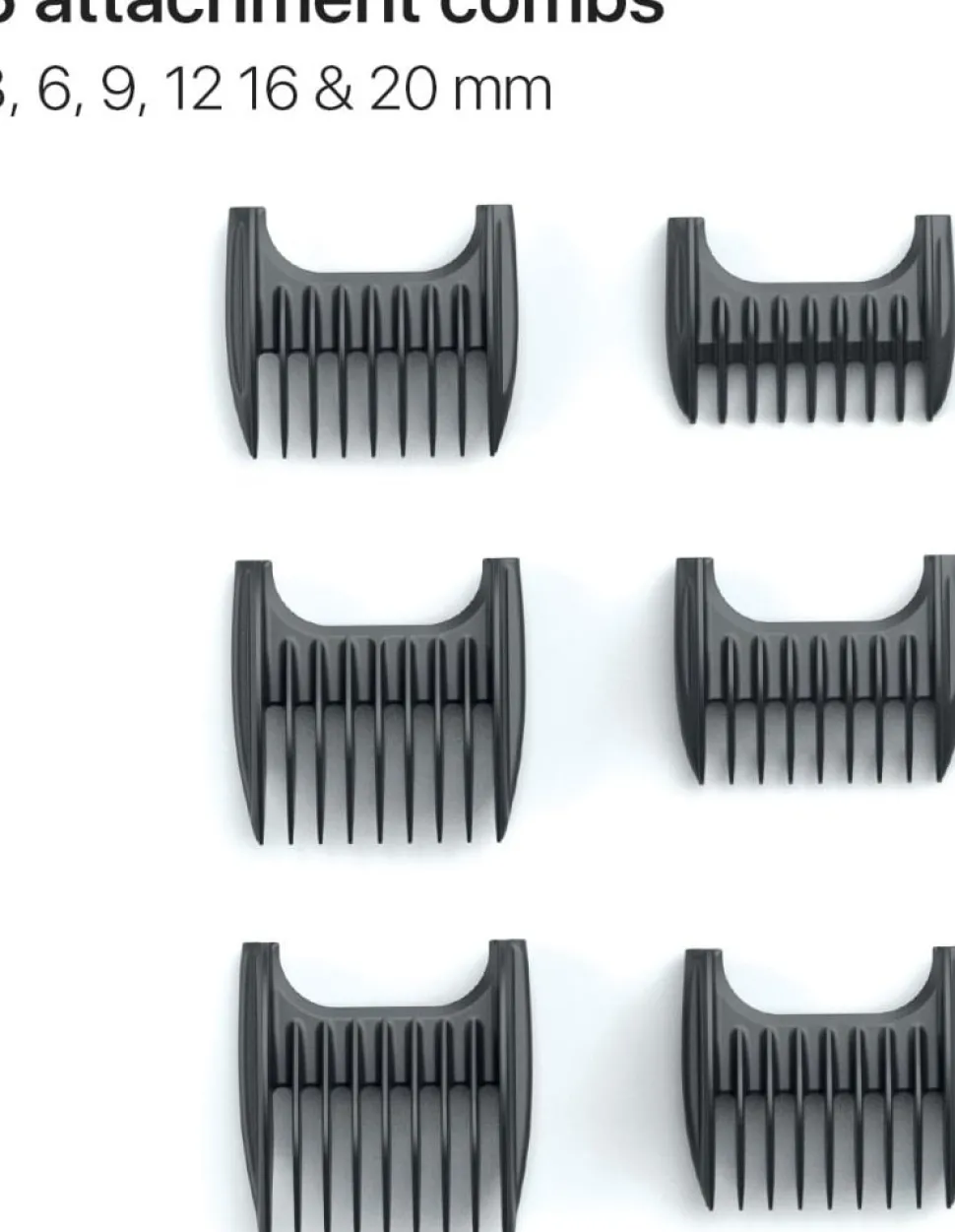 - 6 fastgørelseskamme (3, 6, 9, 12, 16 og 20 mm)