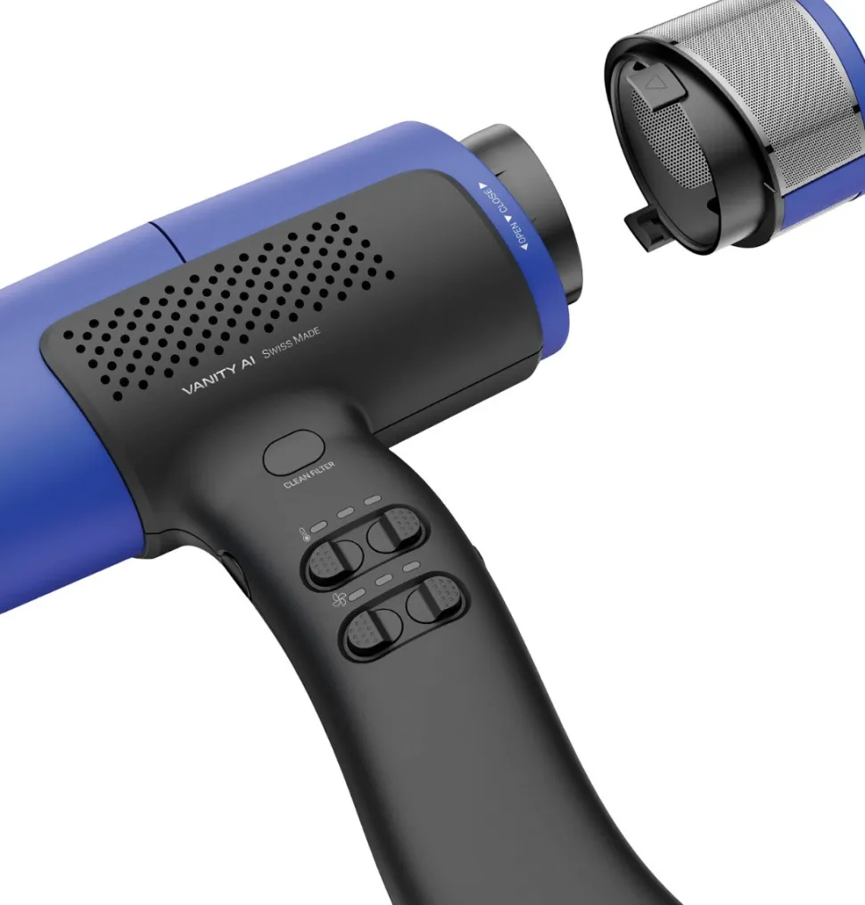 Vanitycare AI er en ultralet, ergonomisk og hurtigtørrende hårtørrer, der er specielt udviklet til professionelt brug. Med den innovative ABT – Air Boost Technology, der inkluderer luftindtagsåbninger over håndtaget, skabes en stærk multiplikatoreffekt, der øger luftstrømmen. Den integrerede auto-rengøringsfunktion rengør automatisk luftindtagsfilteret med et enkelt tryk på knappen, hvilket sikrer pålidelig beskyttelse mod forurening.